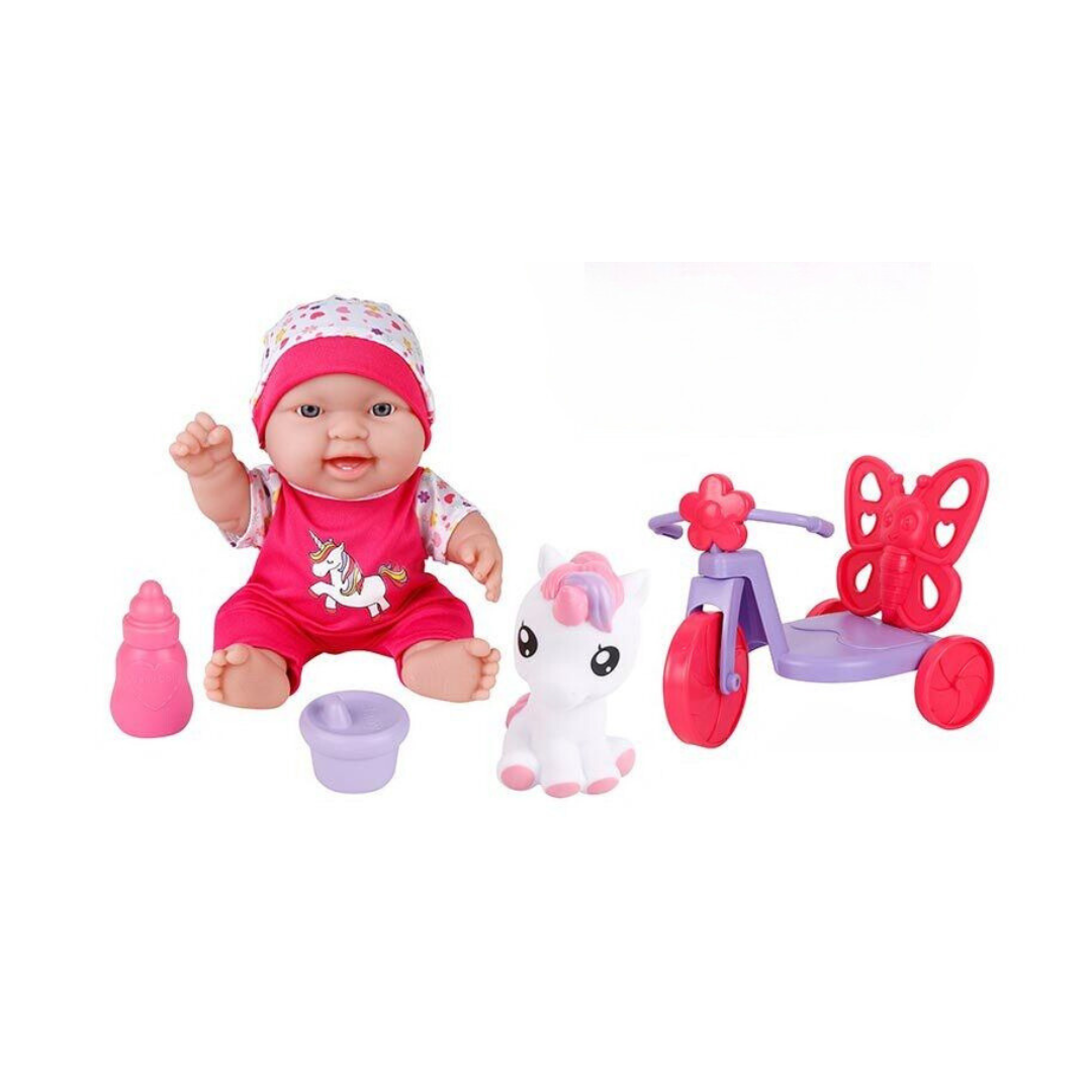 Спортивний гумовий пупс 24 см з велосипедом + аксесуари іграшка єдиноріг дві пляшечки знімний одяг