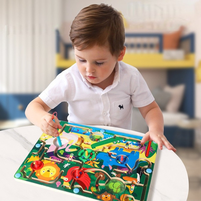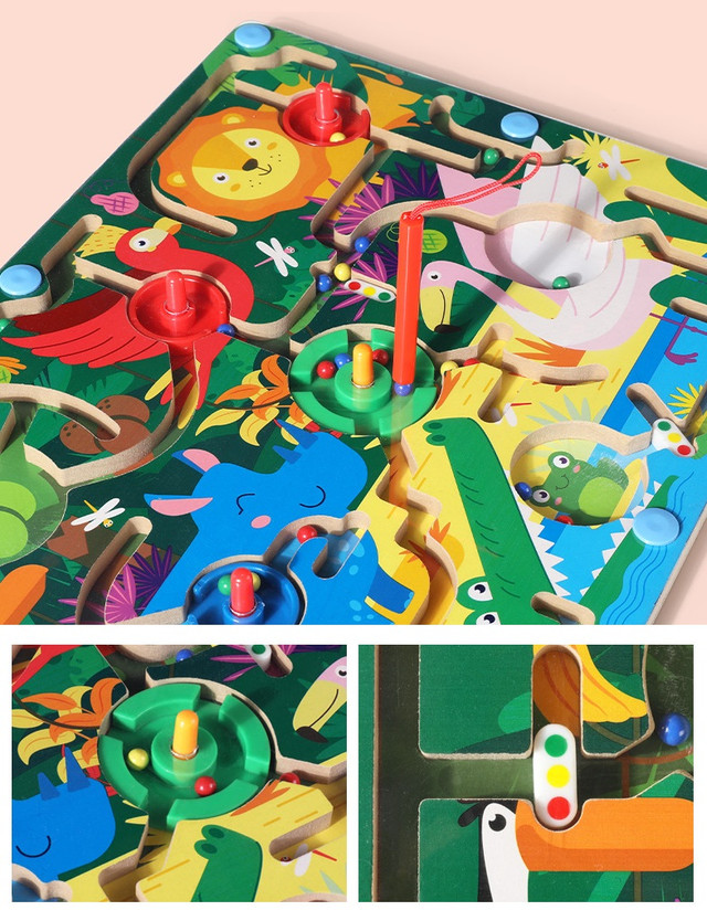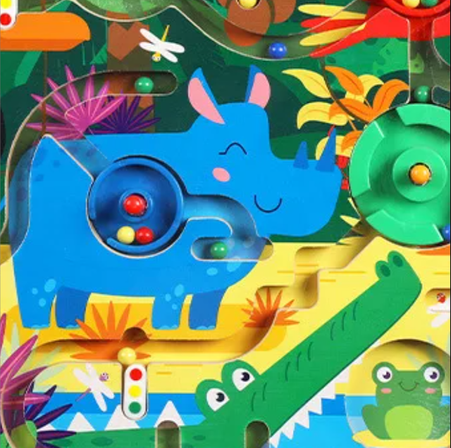 Наш дерев'яний лабіринт - це справжня пригода з численними доріжками, милими звірятками та 24 магнітними кульками! 🦓🎲