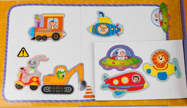 Що включено в цей веселий набір? 4 аркуші магнітних пазлів з анімалістичними тваринами у транспорті, і ще 10 крутих карток із завданнями! 🐘🚗