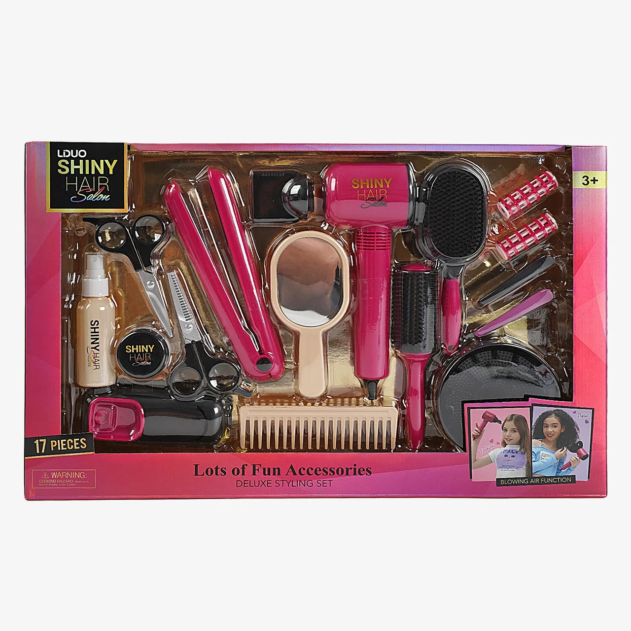 У комплекті — 17 елементів для справжнього салону краси! Фен, що дмухає повітрям, стайлер із підсвічуванням та звуками — усе, як у справжньому салоні.