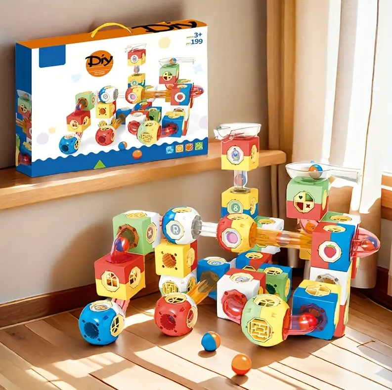 199 різнокольорових елементів, включаючи тунелі, жолоби та воронки.