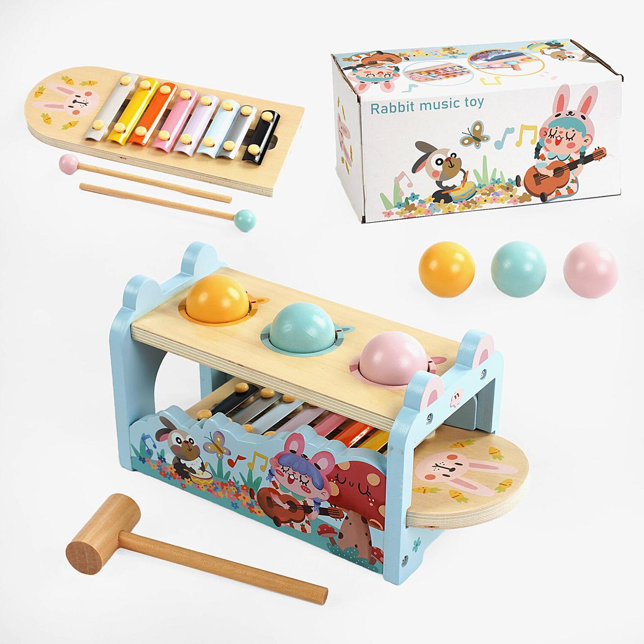 Ігровий музичний центр Кролик для дитини 2в1 Дерев'яна стукалка сортер Бий по м'ячу Ксилофон грай музику