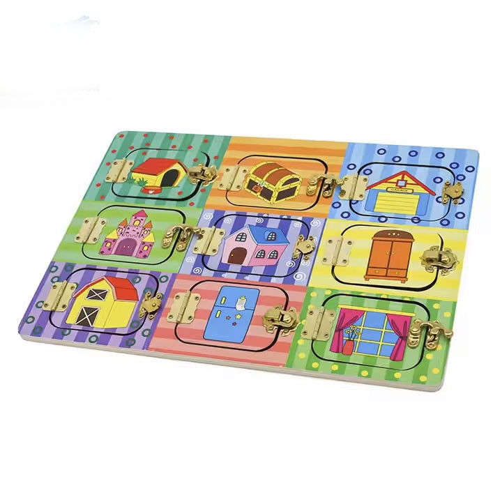 Монтессорі бізіборд містечко Іграшкова дошка з 9 дверцятами та замками дитині для сенсорного розвитку дерев'яна