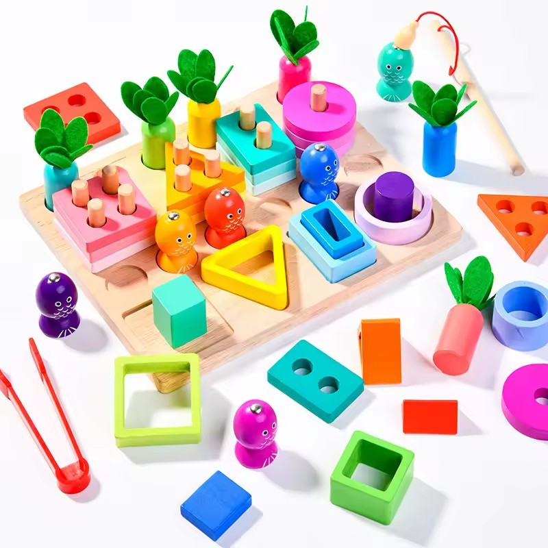 Дерев'яна дошка з набором сенсорних ігор для тактильного та логічного розвитку дитини Риболовля сортер фігури